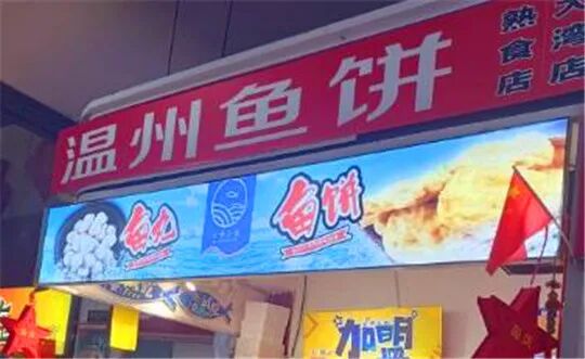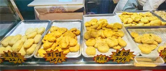 熟食品一号门附近的一家档口,做温州鱼饼,有黄花鱼鱼饼、鱼棍,大头鱼鱼饼、鲜虾饼。表皮炸成金黄有韧性,里面鱼肉细嫩,大头宝口感更鲜嫩一些。