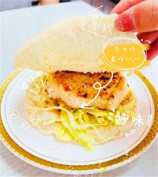 鲜虾饼夹馍,虾饼做的很实在,两面煎得焦黄,白吉馍夹着虾饼、包菜,是不是很有意思。