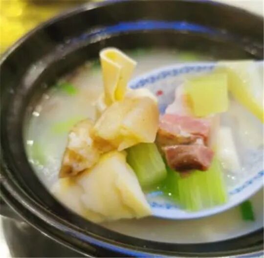 腌笃鲜,把笋、鲜肉、咸肉用砂锅一起炖,浓白的汤底,混合了春笋与咸肉的鲜,现在喝正当季。