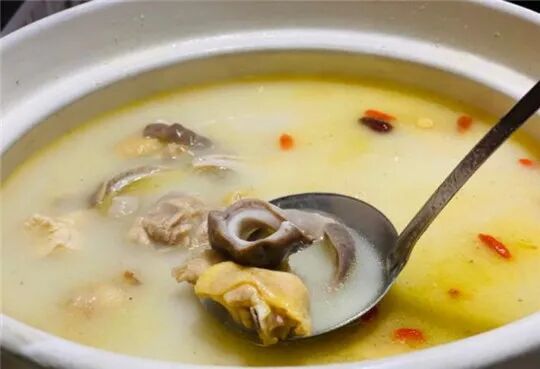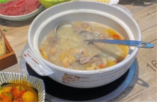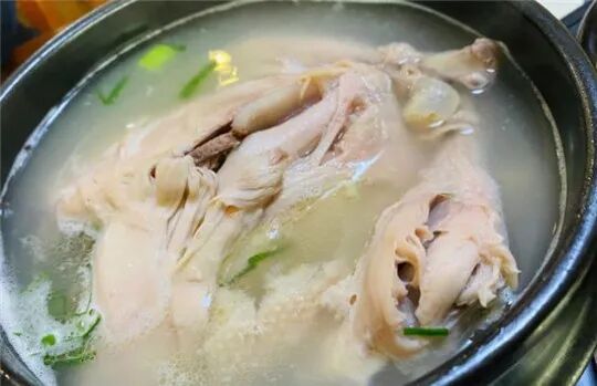 参鸡汤,整只鸡熬煮,鸡不大,一个人就能搞定。鸡肚中添满糯米,配合人参和红枣一起炖,鸡肉完全入味连骨头都软了,鸡肉也不会柴。鸡汤味淡淡的。自己可以加盐和胡椒粉,鸡肉里糯米正好当主食,一碗汤全搞定。