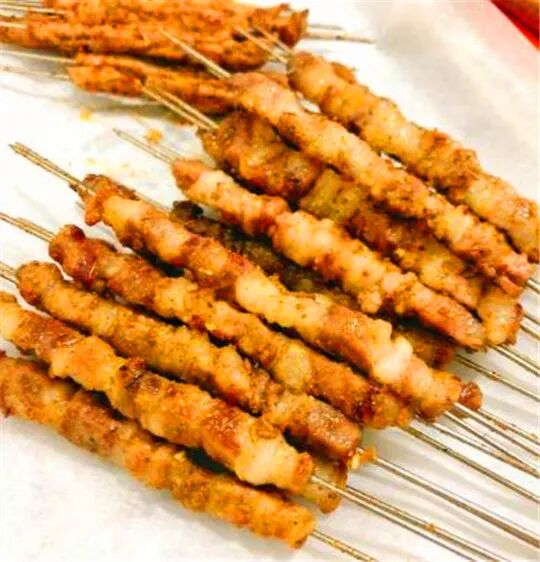 五花肉,肥瘦相间被切的方方正正,烤得火候很好,每串3块肉2块青椒,超香解腻。