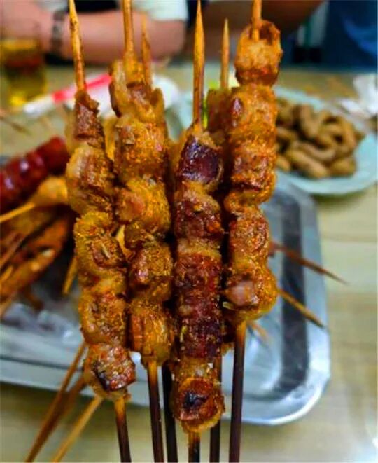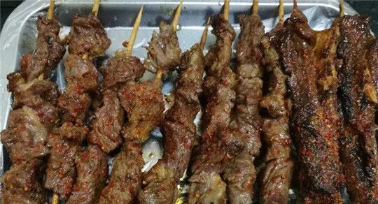 小牛肉,每串只穿4块肉,上炭炉之前,先蘸好秘料,然后快烤,上桌前还要撒上一把葱花。那味道,香气扑鼻。小牛肉最大的特色,可以要求师傅烤三分熟、五分熟或者全熟。