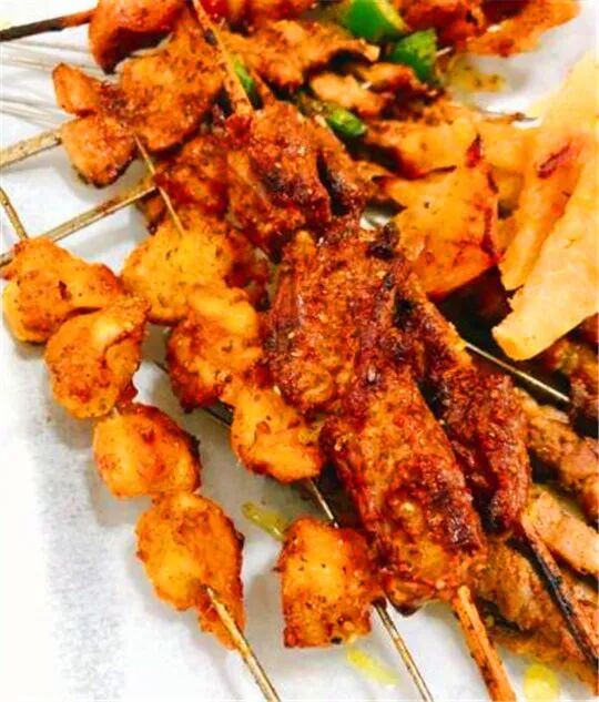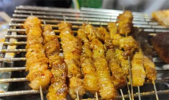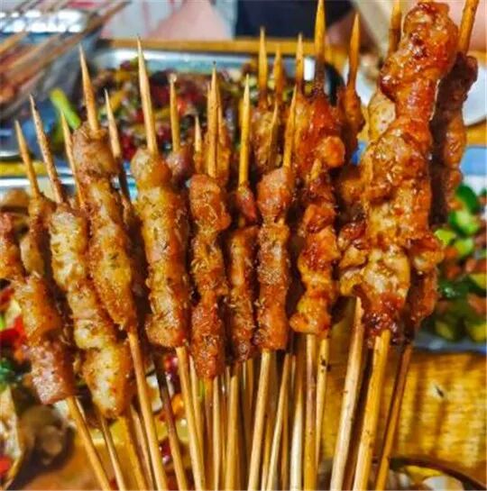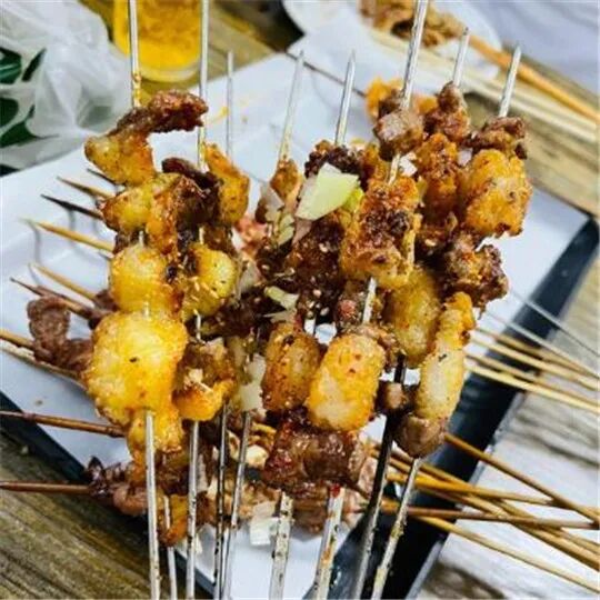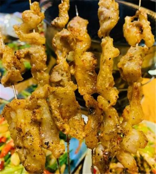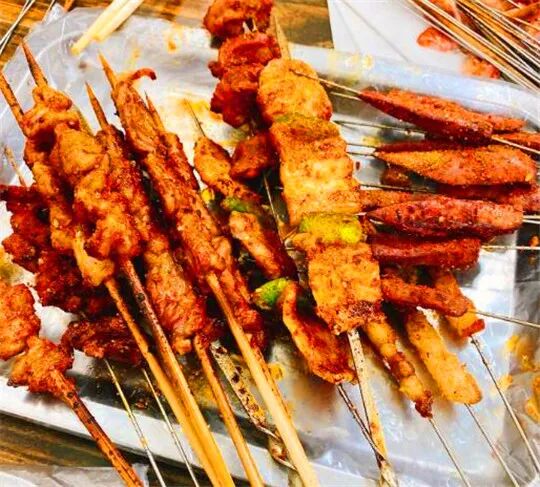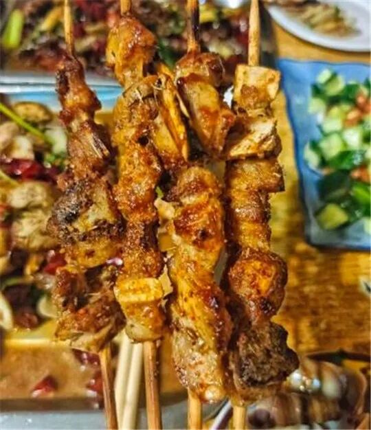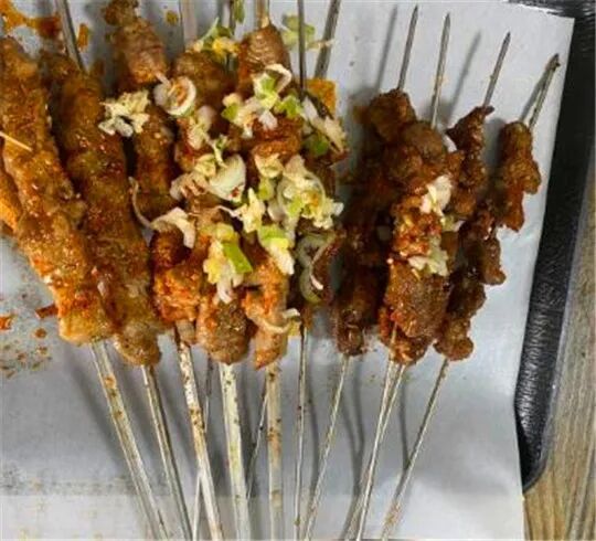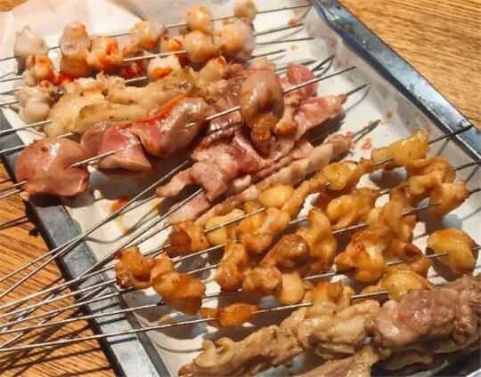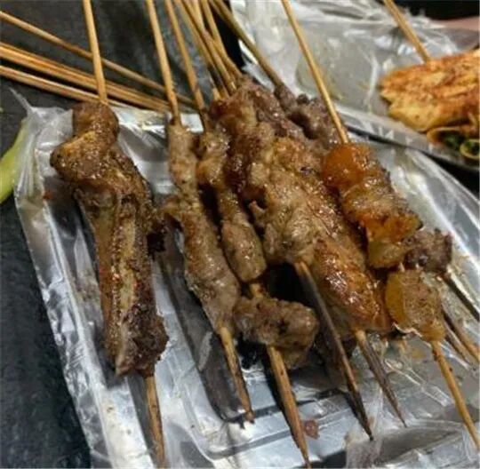 牛肉小串肉质细嫩,香料和孜然味也很足。此外烤肥肠、烤鸡头、烤牛肚、烤肠、烤猪皮、烤鲫鱼等,弄一圈,就差不多了。