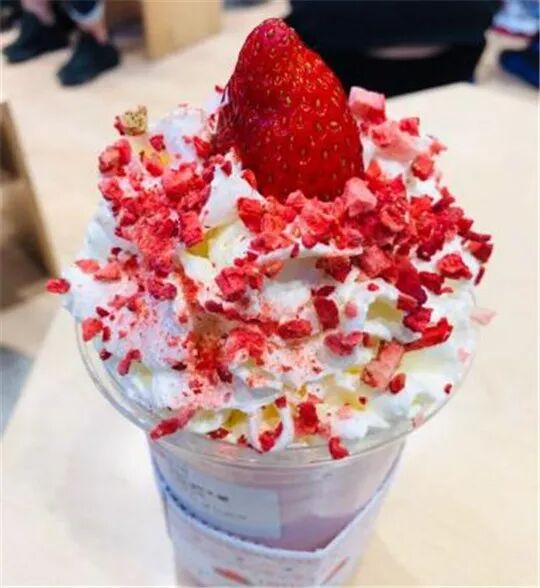 明治姬,新鲜草莓与香醇牛奶交织,打出细腻的粉色冰沙,厚厚的奶油顶带着馥郁的甜蜜气息坐落在冰沙之上,再撒上满满的冻干草莓粒,最后点缀一颗草莓才算是完美落幕。超高颜值,让你不停的横拍竖拍。