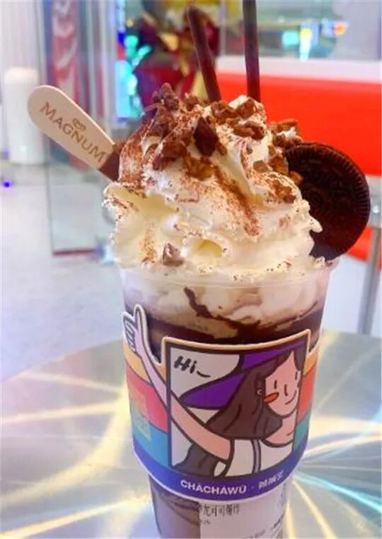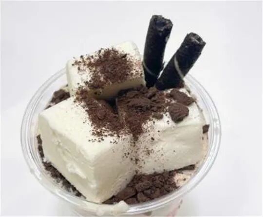 奥利奥风味奶茶冰淇士,手工萃取的焦糖焙火红茶制成奶茶沙冰,搭配大块奶香浓郁的奶砖,再撒上香甜奥利奥粉,放上两根卷心棒。