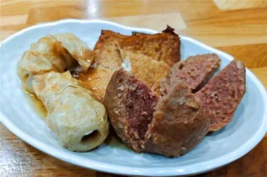如今店也大了,窗明几净的,甏肉不光有肉条、肉丸子、鱼卷、鱼饼、肠等等。甏肉格外装在盘中配米线吃。