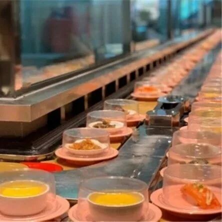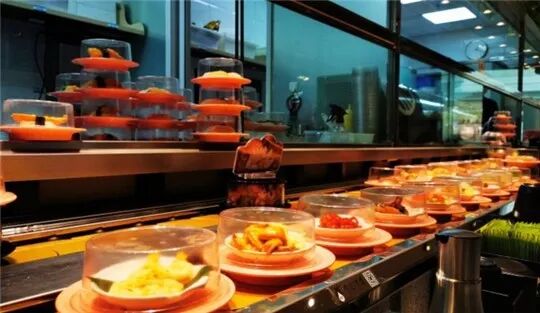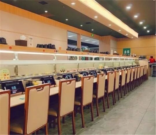 店内传送寿司轨道是双层的,上层用来“送餐上门”的“小火车式”送餐的高速轨道。