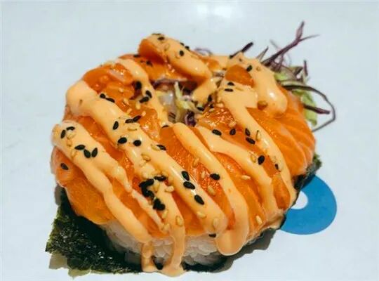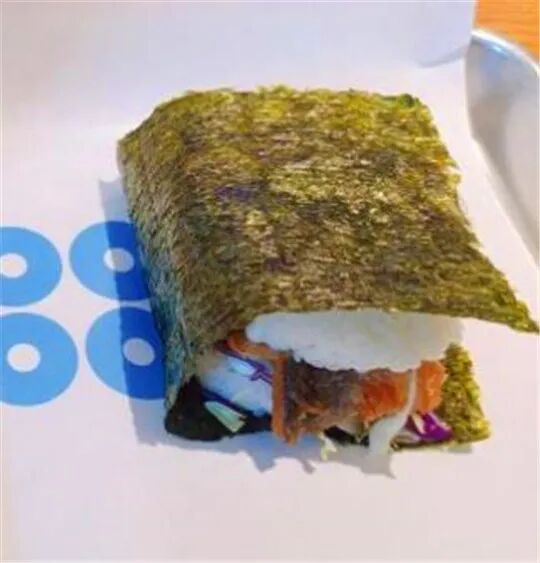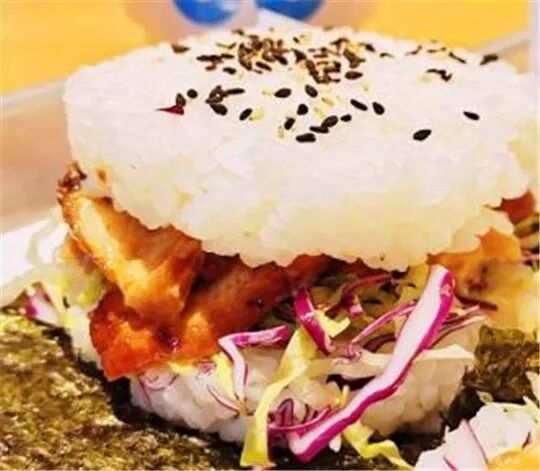寿司汉堡,寿司米做成汉堡胚,中间夹上鱼肉刺身或照烧鸡肉。