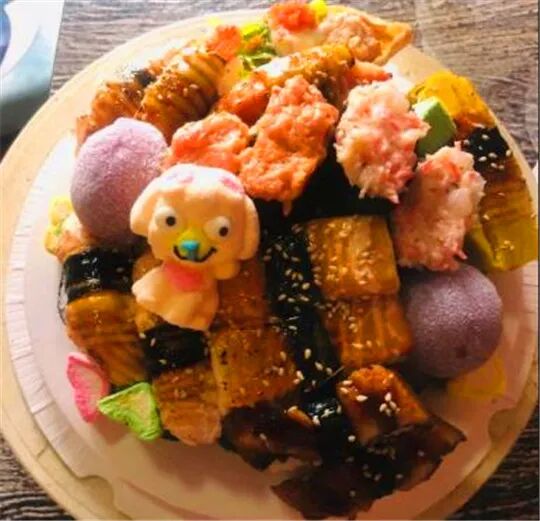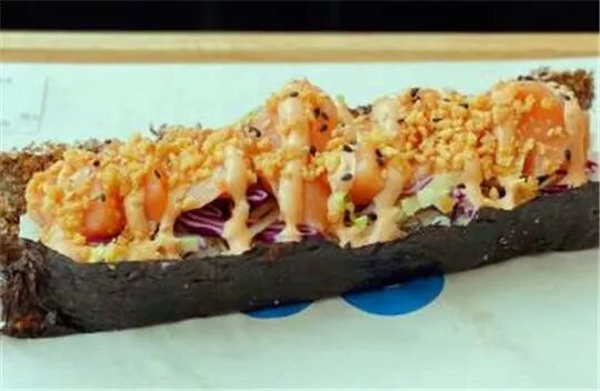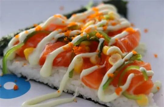 寿司披萨,同理寿司米铺成披萨的样子,上面铺满鸡肉或者烤鳗鱼。
