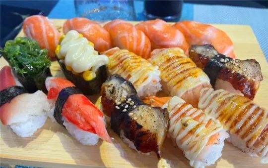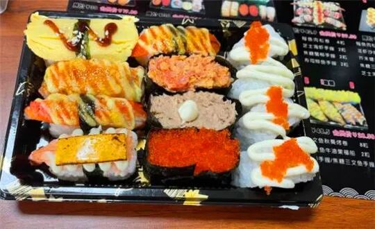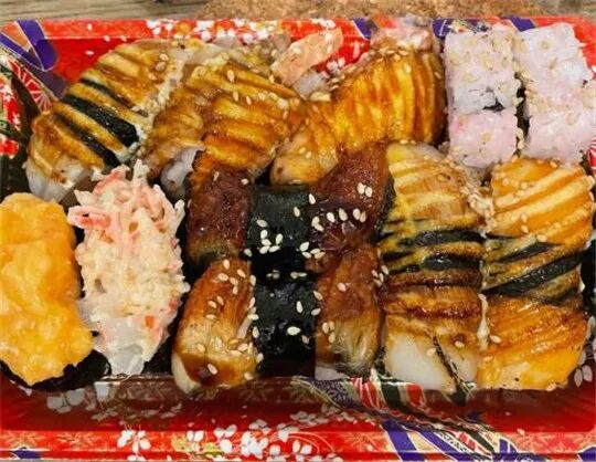 焦糖三文鱼手握、鳗鱼手握、加州卷、稻荷寿司、飞鱼籽军舰······