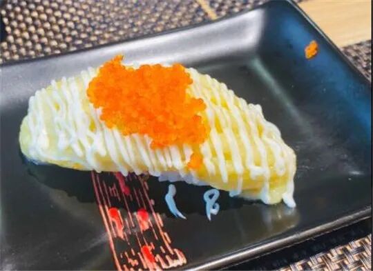 榴莲寿司,榴莲稍微热过,比平时吃起来味道更浓郁,气味都被高温引了出来。果肉混着芝士,甜是蛮甜的。榴莲爱好者应该会很喜欢。
