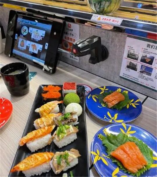 每桌都配有点餐机,菜品都配有相应的图片,顾客只要在ipad上戳一戳,厨师会把做好的寿司放到“列车”上,通过小火车送到食客的桌子边。既增添了趣味,又省却了叫餐的麻烦。