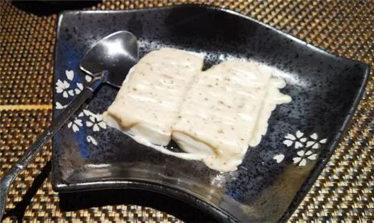 和风豆腐,口感很细腻,撒上白芝麻,淋上酱汁,用这个做开胃菜,挺好的。