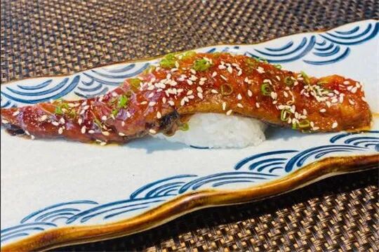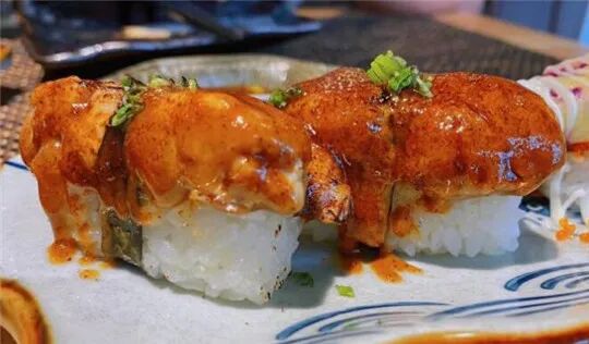 黑椒脑花寿司可是他家店的特色,黑椒的味道,细嫩的脑花,配上柔软的米饭,口感太丰富。还有毛肚寿司、肥肠寿司······