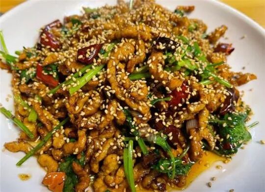 香辣肉丝,肉丝划过油,裹的酱汁浓郁,加干辣椒、香菜梗、最后撒上大量的芝麻,甜辣口,下饭。