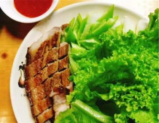 菜包肉,厚实五花肉卤煮入味,切成厚厚的肉片。蘸上秘制酱料与泡菜一同包在生菜之中,实在是香。