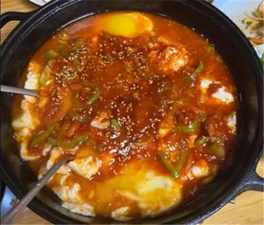 还有一款石板豆腐也很下饭,嫩嫩的内酯豆腐配上2个鸡蛋,上面淋上一层酱料,靠石板的热度煨熟,就是小心烫嘴。