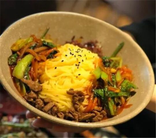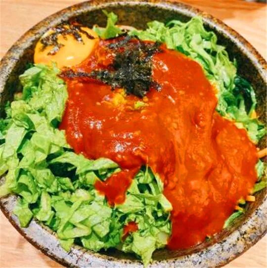 没有像其它韩餐店给一排小菜,只有一种。石锅拌饭,各种新鲜配菜搭配软糯的米饭,倒入拌饭酱充分搅拌。没多久那股酱料和米饭混合起来的香味就窜了出来,上头。