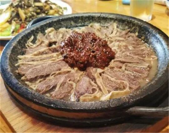 石锅带皮牛肚肉,一片片码放的整整齐齐,肉炖得软烂,蘸上自制料,你们可以尝尝。