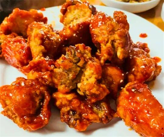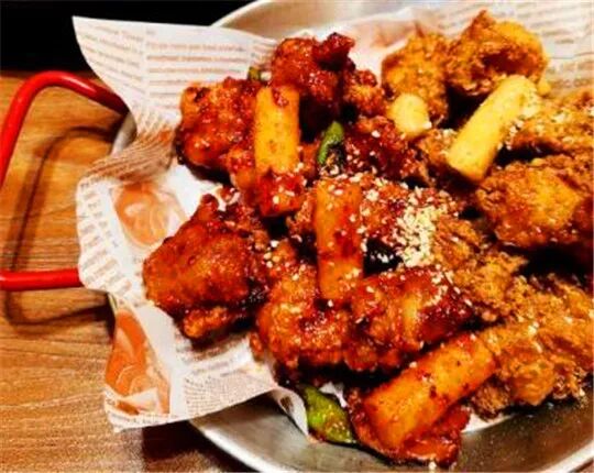 辣味鸡块,带骨的鸡块炸得外酥里嫩的,裹上酱汁,甜辣甜辣的。