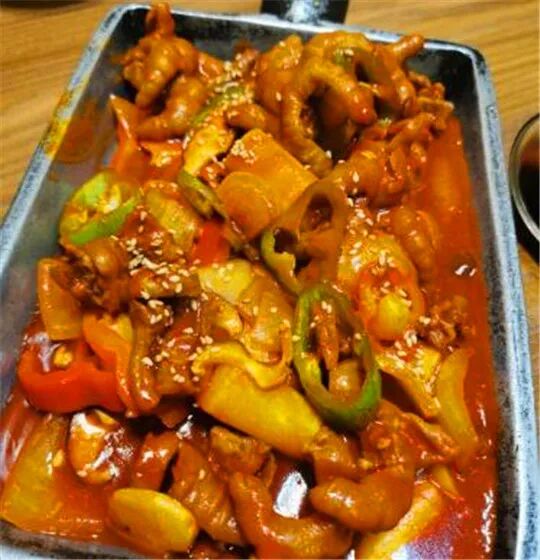 辣鸡爪,鸡爪脱骨,里面有香菇、年糕、圆葱,趁热吃无骨的鸡爪嫩到不行,入口即化的,一抿就可以了,凉了还是有点韧性的。