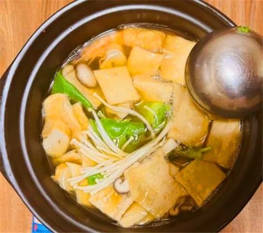 韩式鱼饼锅,满满一锅的鱼饼~ 有小青菜和金针菇点缀,汤透口味鲜亮 ,喝酒的时候一定要点,一碗鱼饼汤下肚,醉意仿佛也散了不少,汤鲜鲜的,胃暖暖的。