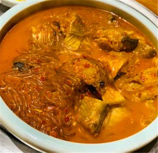 明太鱼炖粉条,鱼肉被切成一大块一大块的,鱼肉炖得嫩嫩的,底汤加了粉条和韩式辣酱,顺滑鲜辣的。