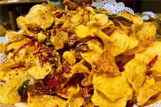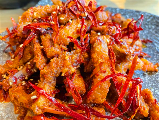 香辣牛肉条,牛肉过油干煸的口感,口感酥脆有嚼劲。炸鸡爪也是软糯脱骨,下酒。