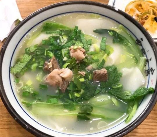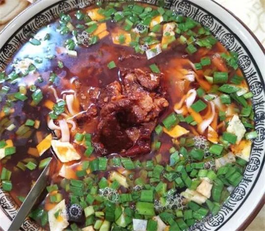 它家的羊肉烩面,宽面条,软烂的羊肉、碧绿的小白菜,洒上一勺子羊油辣椒,香菜。