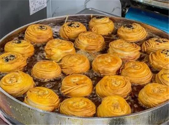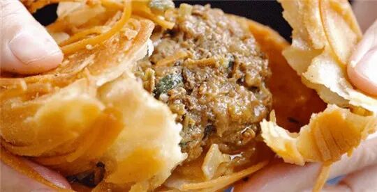 网红的金丝牛肉饼,现包现煎,3种味道,金丝牛肉饼、金丝梅菜肉饼、拉丝蛋黄芝士饼。主打款金丝牛肉饼,层层金丝环绕,紧紧缠绕,正确的打开方式应该是沿着侧面,顺着金丝的纹理,轻轻一掀,就露出了里面汁水满满的大块牛肉饼。