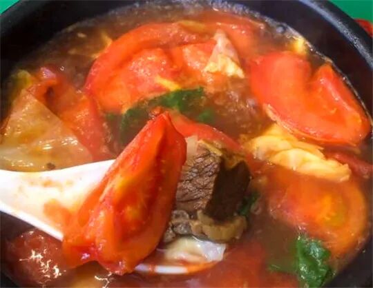 番茄牛肉锅,西红柿切的块很大,里面的牛肉炖很烂,很入味。汤汁浓郁很下饭。