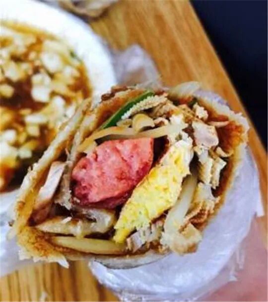 给的菜料特别足,一定要趁热吃,煎饼特别香,刚做好的边儿脆脆的。还有大烤肠煎饼果子。