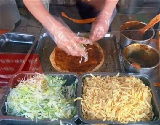 煎饼是山东煎饼那种感觉,一掀起来折叠上,声音脆脆的。涂抹在煎饼上大酱(应该是吧)很厚实,能看出来是加了料炒过的。