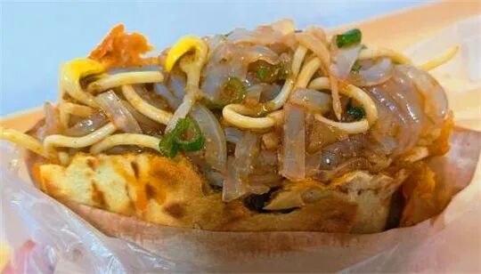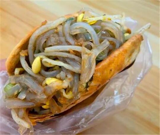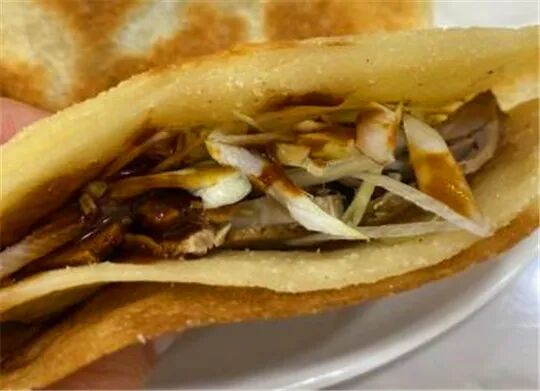 它家也是需要排队的,饼烙的外酥里软不油腻,跟传统的熏肉大饼还真有点不一样,是卷着吃,素饼卷土豆丝、豆腐丝、葱丝,刷上酱汁。也可以卷熏肉、烤肠、煎鸡蛋,很香。