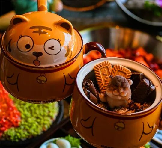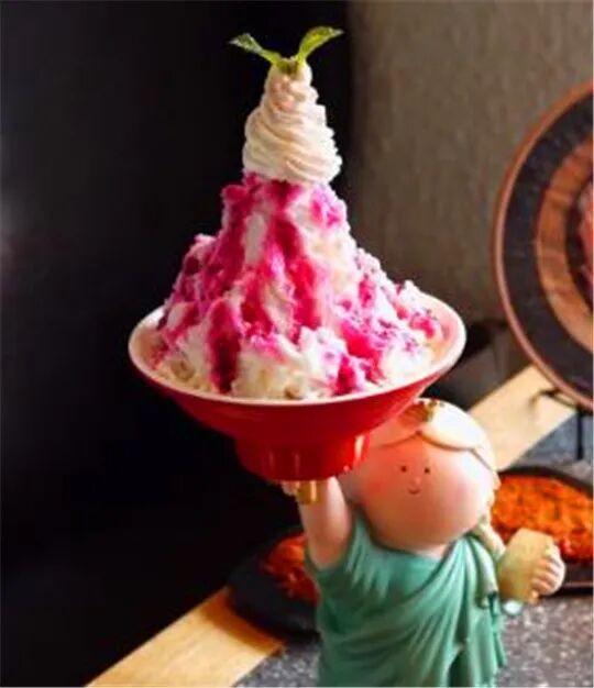 网红的绵绵冰太吸睛,巧克力雪花冰,竟然用的小老虎的搪瓷缸子,小老虎造型的雪冰淋的巧克力、威化饼干,好吃又好看。自由女神举着个绵绵冰,好看还解辣。