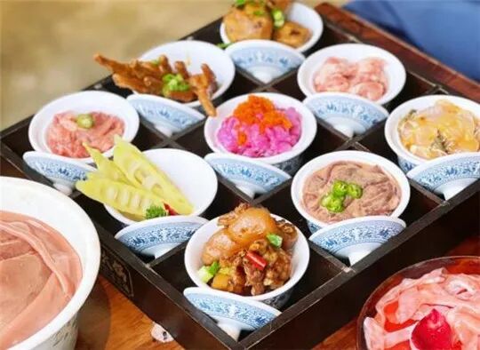 如毛肚、鸭肠、鸭血、麻辣牛肉、午餐肉等九道菜,分别装在九个小碗里,形成一道特色菜九大碗,冷锅鲜鸭血,直接倒入锅底,开火煮,这样鸭血越煮越嫩,筷子都夹不稳。
