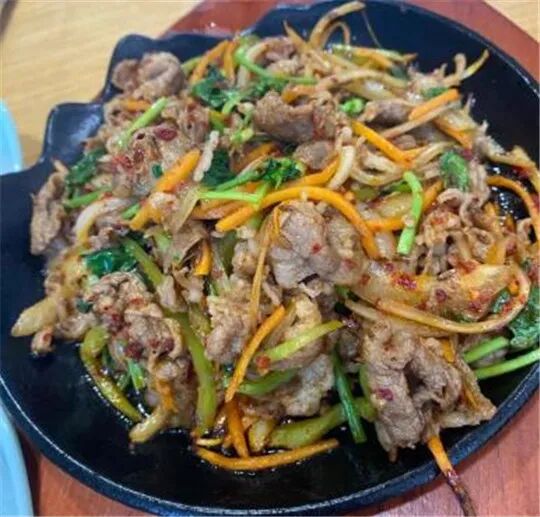 铁板牛肉,香香嫩嫩的,有着孜然的味道。