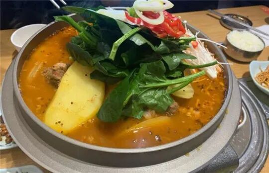 韩式脊骨锅,热腾腾的一大锅,内容也丰富,有脊骨、土豆、辣白菜、茼蒿、金针菇,咕嘟咕嘟热乎乎。