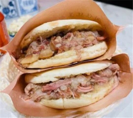 腊汁肉夹馍,白吉馍烤的酥酥韧韧的,肉是肥瘦相间的,肥的多一点,油油香香的,肉汁也丰富,吃完纸袋都浸透了,好吃。还有一款纯瘦肉夹馍外,更喜欢肥瘦相间的。还有要说店家的辣子超级超级香。