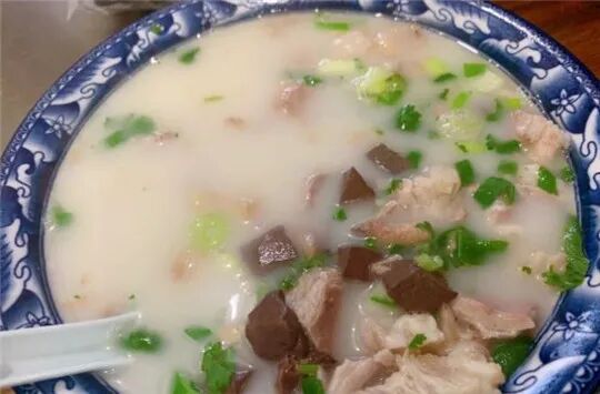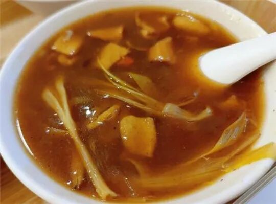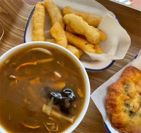 滋补胡辣汤,里面配菜有面筋、木耳、黄花菜等,喝起来虽然辣,但没辣那么狠,胡椒味浓,还有香的口感。保证口口连汤带菜,汤的重口也得以中和,喝起来很舒畅。