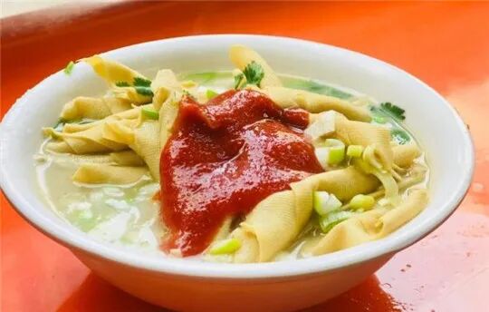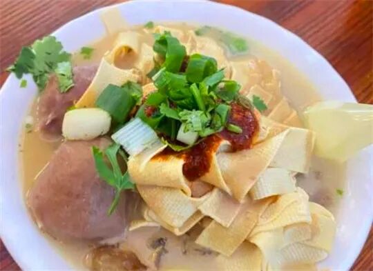 口感和别的地方还是有些不一样的,烙出些许的糊疙最好吃,就连芝麻酱也是现榨现磨的,味道特别香。淋上,蒜汁、酱油、再拌上芝麻酱,吃起来很满足。蒜酱用的紫皮独头蒜,比较辣少放。还有骨汤豆腐皮,豆皮在骨汤里炖得软嫩,仅仅加了芝麻酱和蒜水,味道就足够。芝麻酱还可以外带。