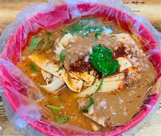 煎好的焖子金黄油亮,里面通体晶亮透明,软软的,糯糯的,再加上高汤豆皮和各种调料,香辣扑鼻,颇有余味。虽然现在被很多吐槽味道大不如前,但还是作为网红店般的存在。