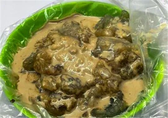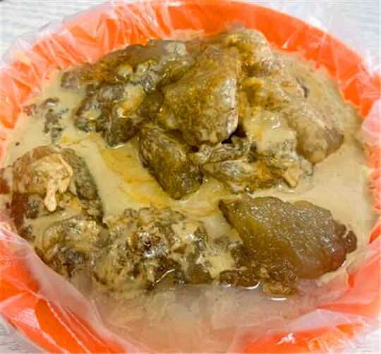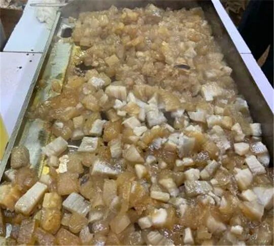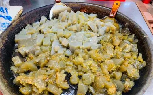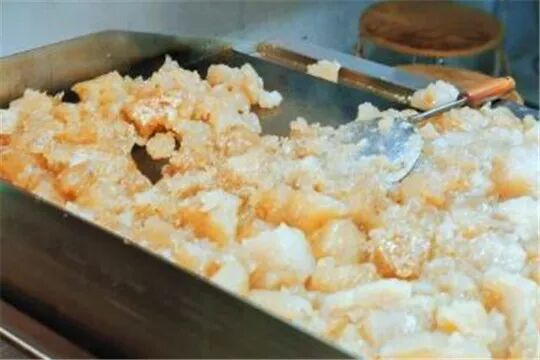 一家老焖子铺,店面是一长溜,不算大。焖子都是自己家熬的,纯地瓜淀粉,地瓜来自盐店。焖子是深色的,Q弹紧实。