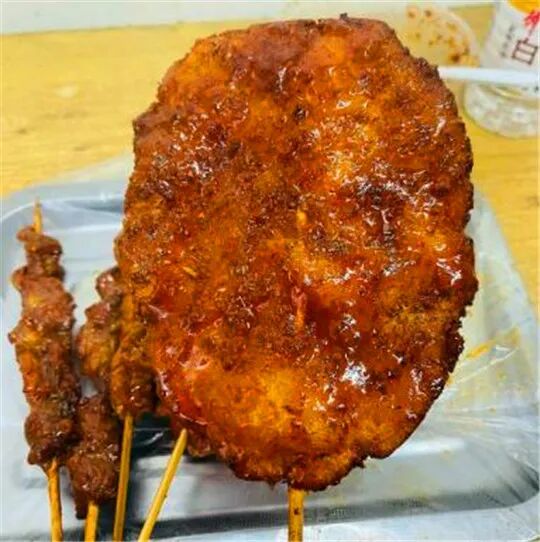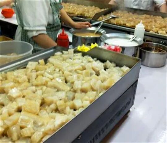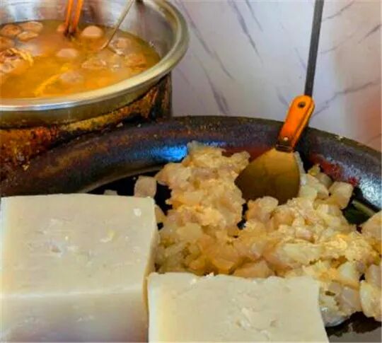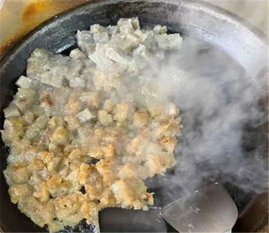 他家有种小时候的味道。用的小叉子都是那种小铁叉,那可是儿时最美好的记忆。在平底锅中煎焖子,焖子煎到软糯带ge的焖子,特别香。