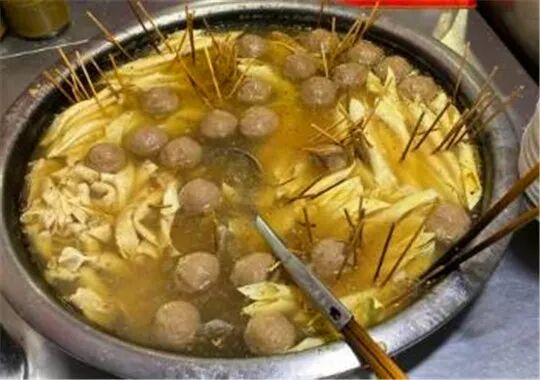 它家的豆腐串是大连街上的老资格,门口一口锅中煮着豆腐皮,上面还飘着各种的小丸子。豆腐皮很嫩,主要是鸡汤打底做的,鲜鲜的。撒上葱花,配以辣子芝麻酱,散发着诱人的香气。