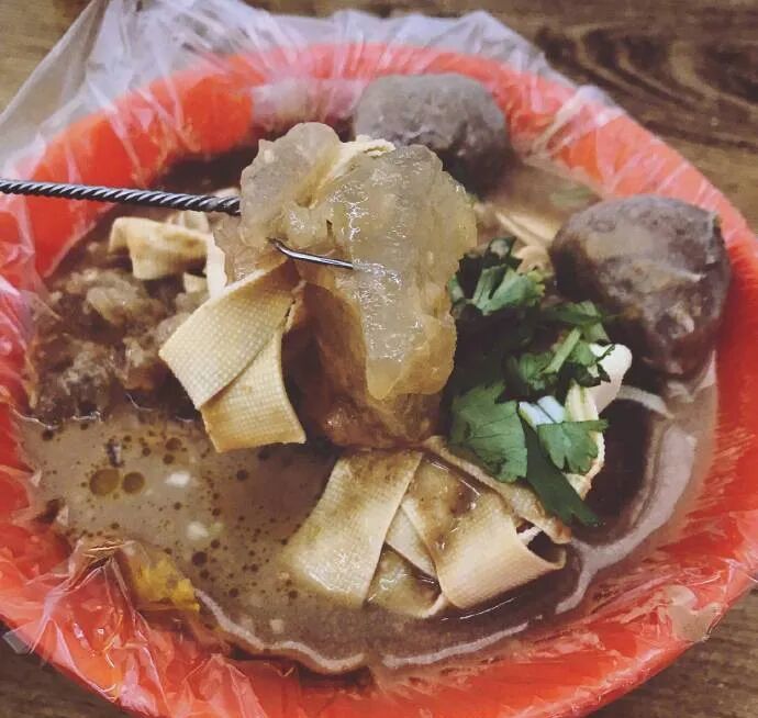 门口的大锅里还煮着豆皮和牛肉丸,豆皮鸡汤熬制的汤底真是特别鲜,好吃。除了可以堂食,还可以买生的自己回家煎。