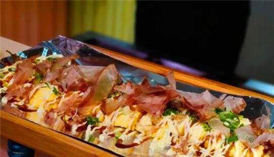 大阪烧,面饼在铁板上滋滋作响,光是看这烧制过程就相当诱人。挤上照烧酱、沙拉酱;再撒上海苔丝和木鱼花。一边酥脆,里面却很香浓,要趁热吃啊~~