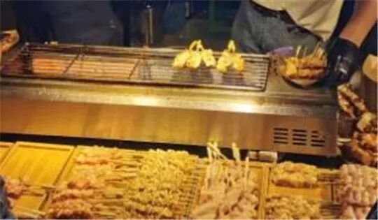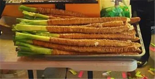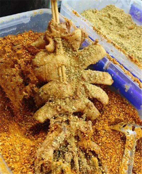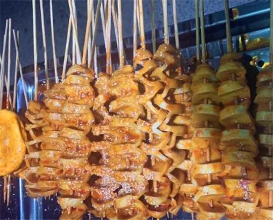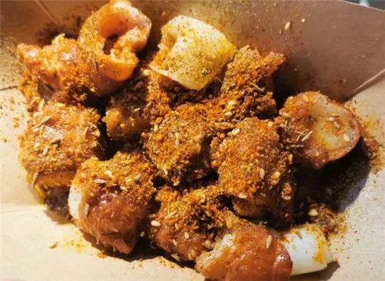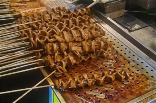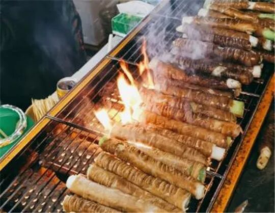 妥妥的网红美食,肥肠爱好者一定要试试。大肠包大葱,串好了在烤架上烤的,根据口味可以选择撒椒盐、辣椒、芝麻等。