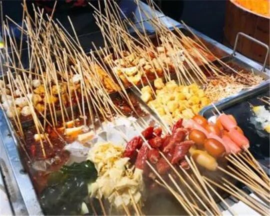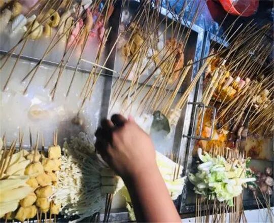 门前蒸腾的热气,大小一致的格子,里面分别煮着不同的串串,荤的素的串串。
