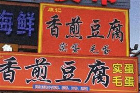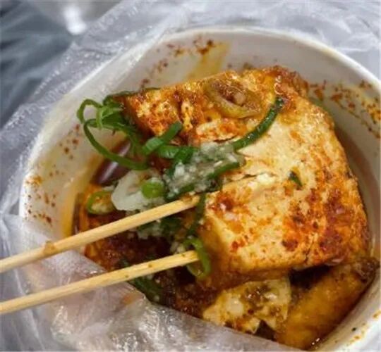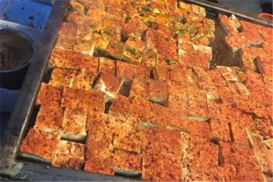 铁板上抹上料油,然后摆放豆腐,豆腐中煎至微黄后,撒上秘制酱料。